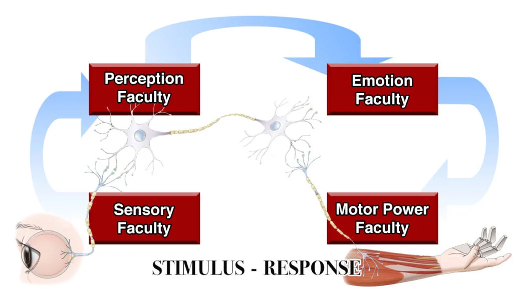 Animals do not have these higher four faculties. As such, whenever the stimulus-response link is established within an animal, the animal is limited by its conditioning (like with the ‘whistle-salivate’ response in Pavlov’s experiment). That is, an animal…